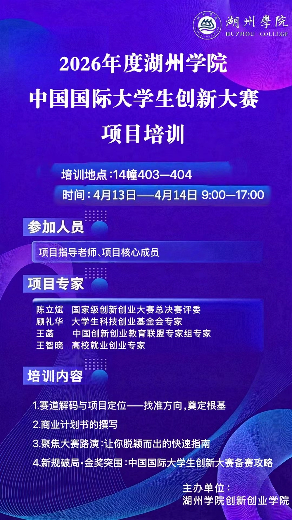 为全力备战2026年中国国际大学生创新大赛,切实提升我校参赛项目质量与师生备赛能力,精准把握大赛评审规则、备赛要点及金奖项目打造策略,湖州学院创新创业学院特组织开展2026年度中国国际大学生创新大赛专项培训,现将具体事宜通知如下: